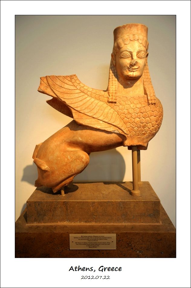 这尊公元前570年到公元前550年的雕像是在斯巴达(Spata)发现的,叫做“大理石狮身人面像”(Marble Statue of a Sphinx)。
