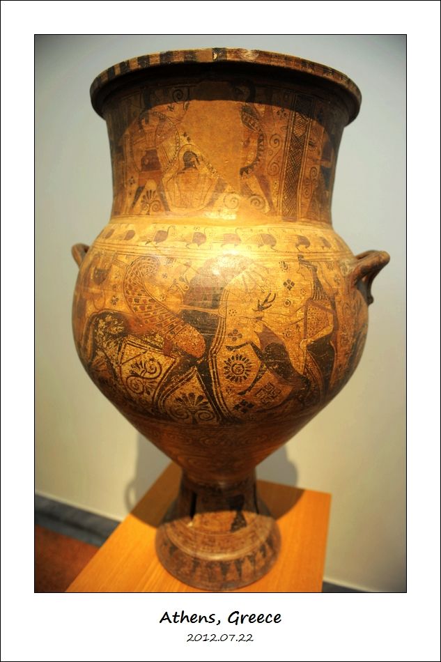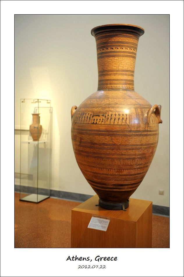 这个大陶罐年代比较早,公元前760年到公元前750年的东东,叫做“底比隆画家制作的几何花纹容器”(Geometric Amphora by the Dipylon Painter)。