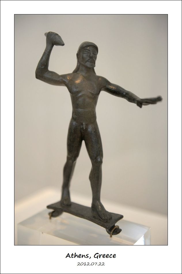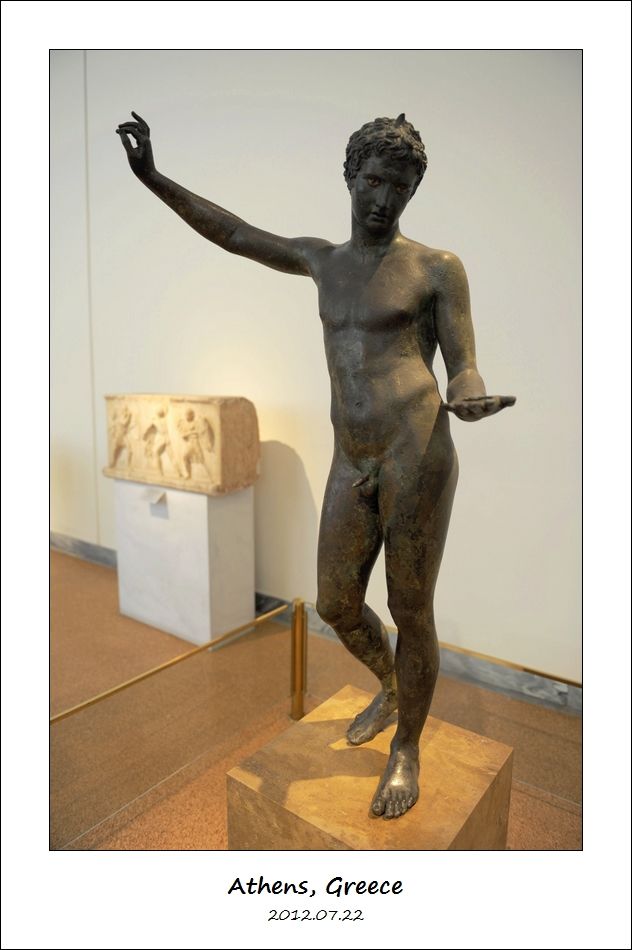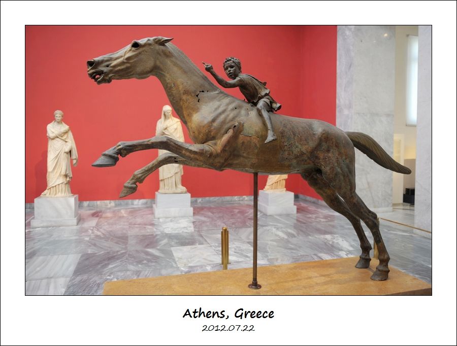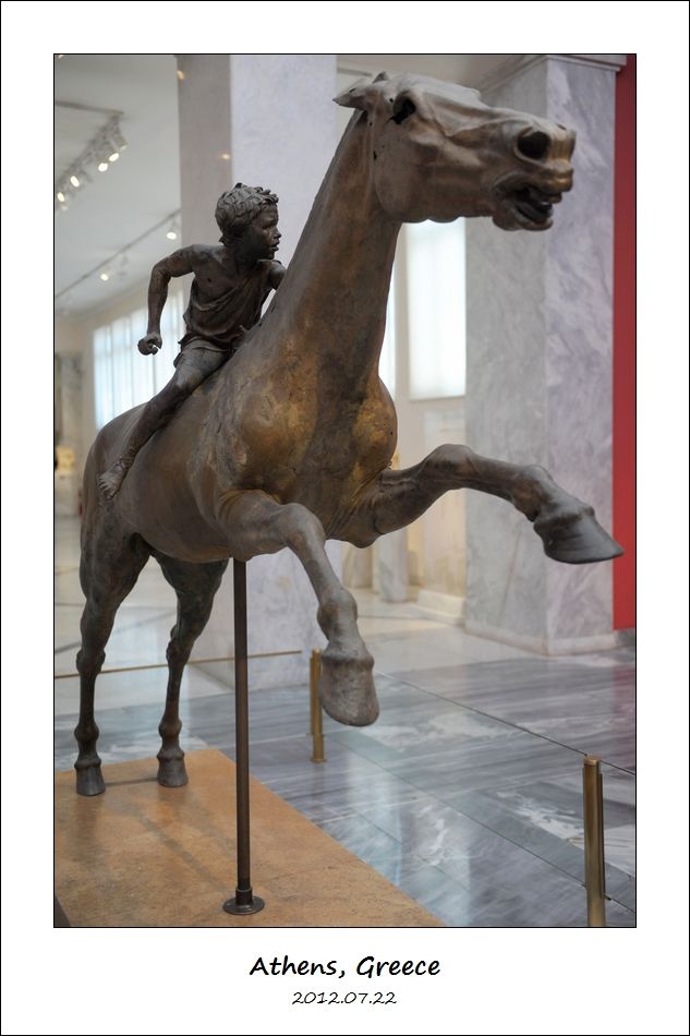 这尊公元前140年的青铜雕像太有名了,叫做“年轻的马师在骑马青铜雕像”(Bronze Statue of a Horse and a Young Jockey,又叫做 Jockey of Artemision)。