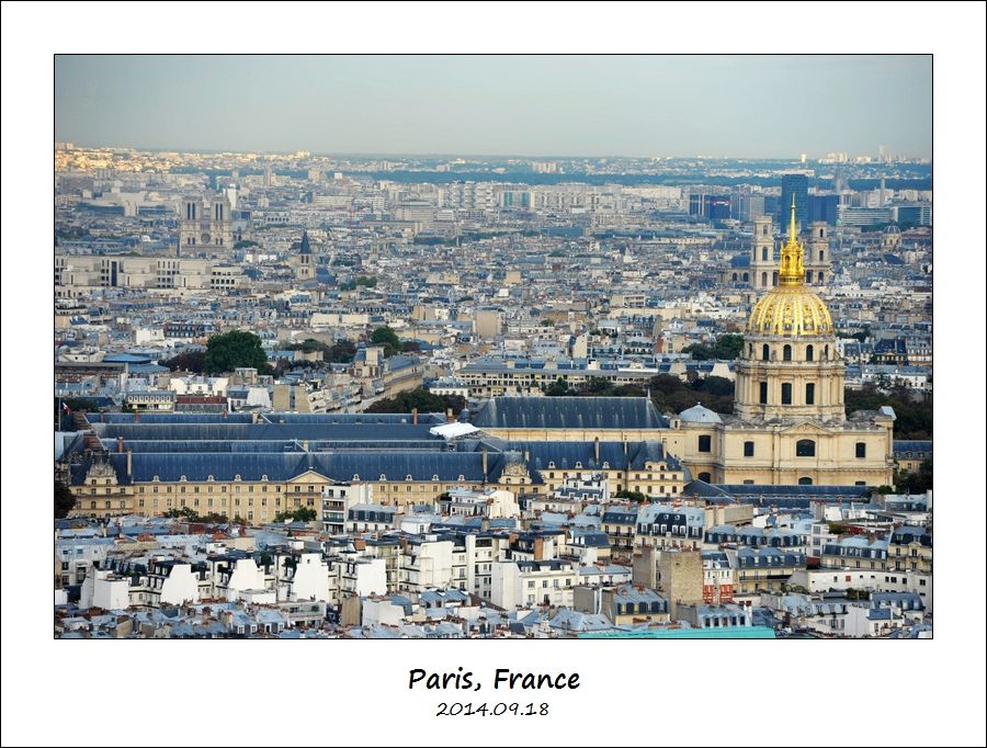 左面的塞纳河,中间的荣军院,右面的蓝色边框的大楼是蒙巴纳斯大厦(Tour Maine-Montparnasse)。