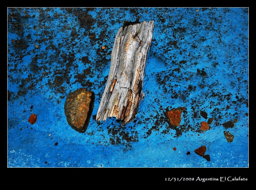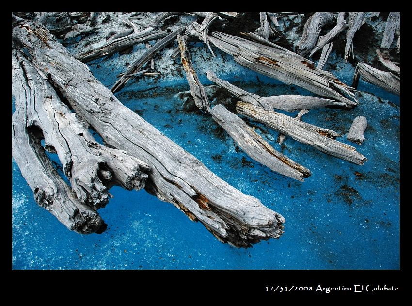 干枯的木头,石头,在幽蓝的冰川上,很美丽。