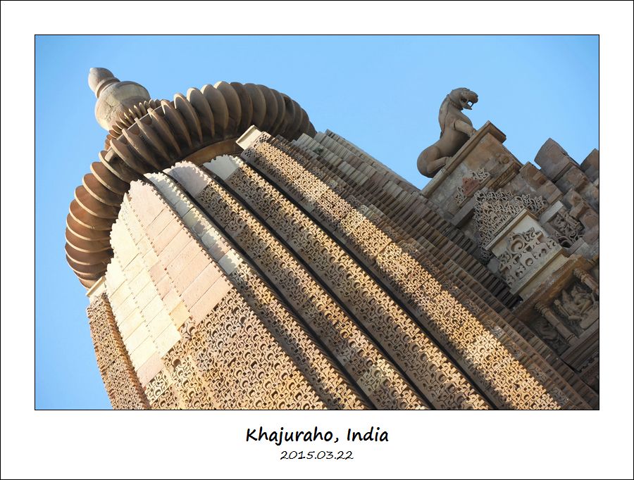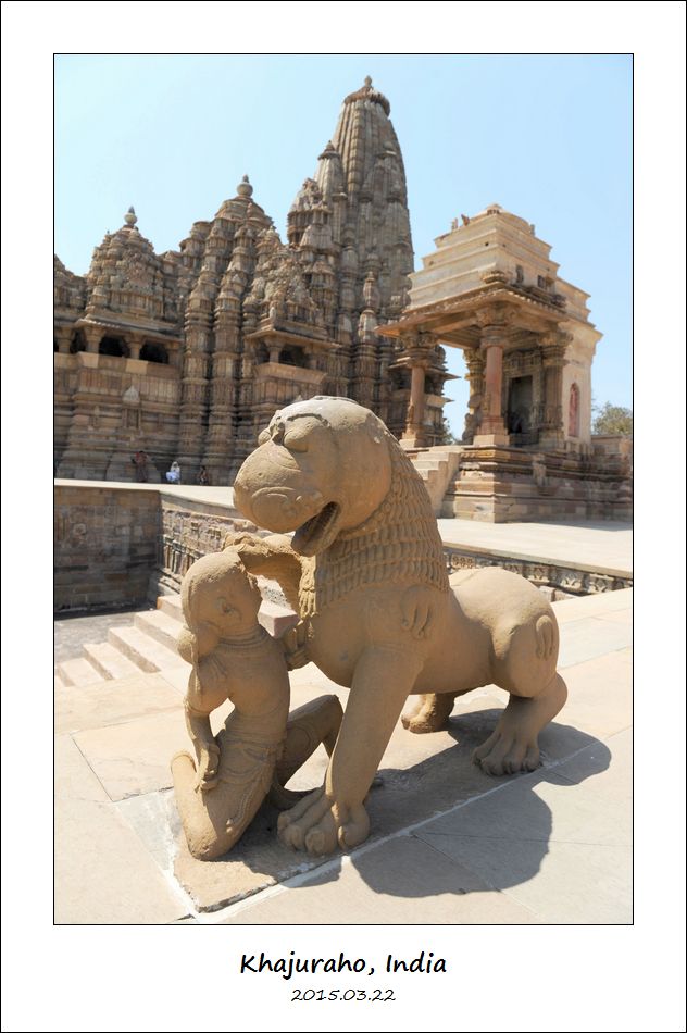 背景前面小的是摩诃提婆神庙,可以看到门口的另一个 Sardula,后面大的是坎达里亚·摩诃提婆神庙。